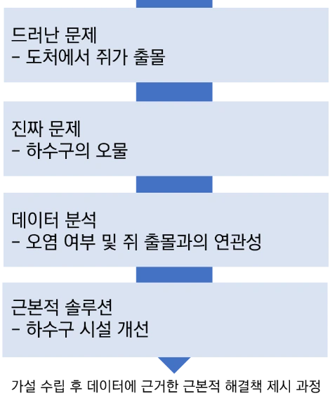 위와 같은 과정을 거친 후 데이터 분석으로 하수구 오염 여부를 확인하고, 쥐 출몰과의 연관성을 파악하면 됩니다. 이 가설이 맞다면, 하수구 시설을 개선하는 것이죠. 이처럼 문제를 재정의하는 것이 우리가 데이터 분석을 할 때 가장 중요한 것입니다.