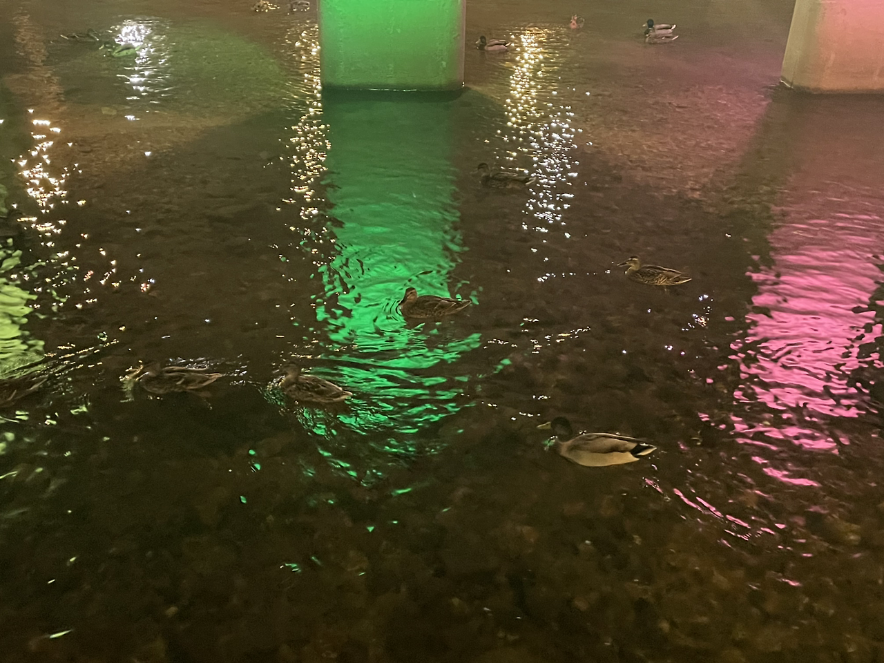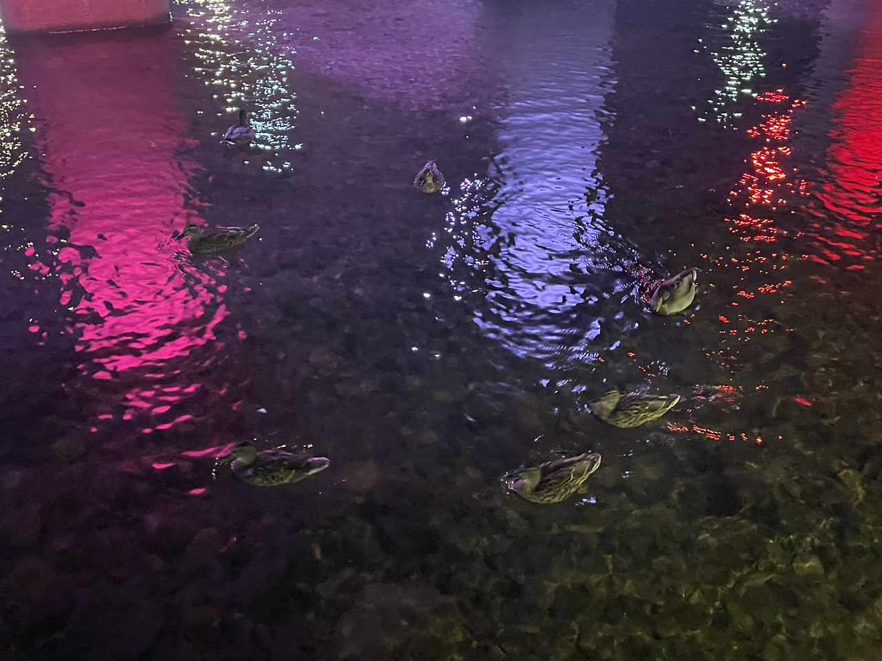 도림천 터줏대감 오리들이 반상회 중이었다. 형형색색 조명 아래 엄청 많은 수의 오리들이 모여있었다.