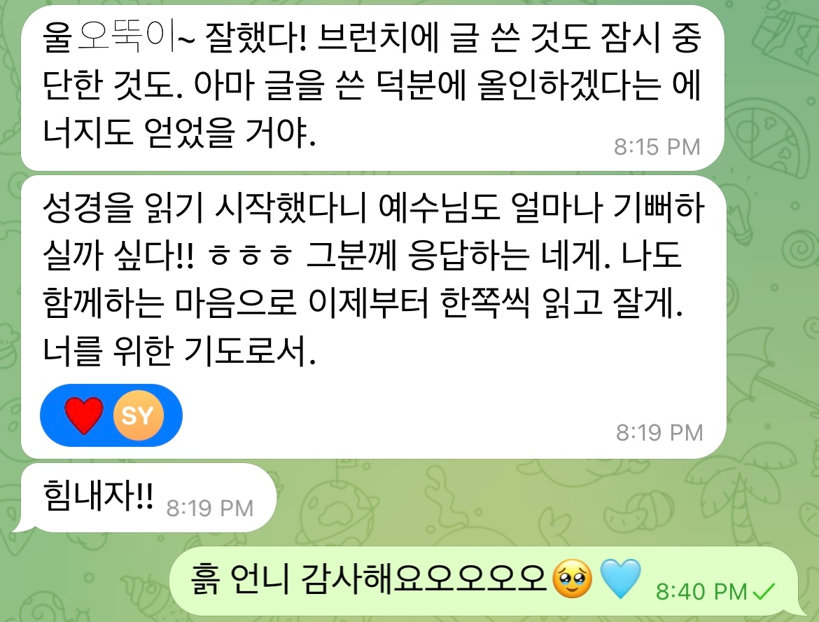 성경을 읽기 시작했다는 소식을 캄보디아에 있는 내가 사랑하는 언니에게 전하니 언니도 함께 읽겠다고 했다… 매일 밤 언니와 함께 기도하는 마음으로 읽고 자야지. 언니 사랑해요..