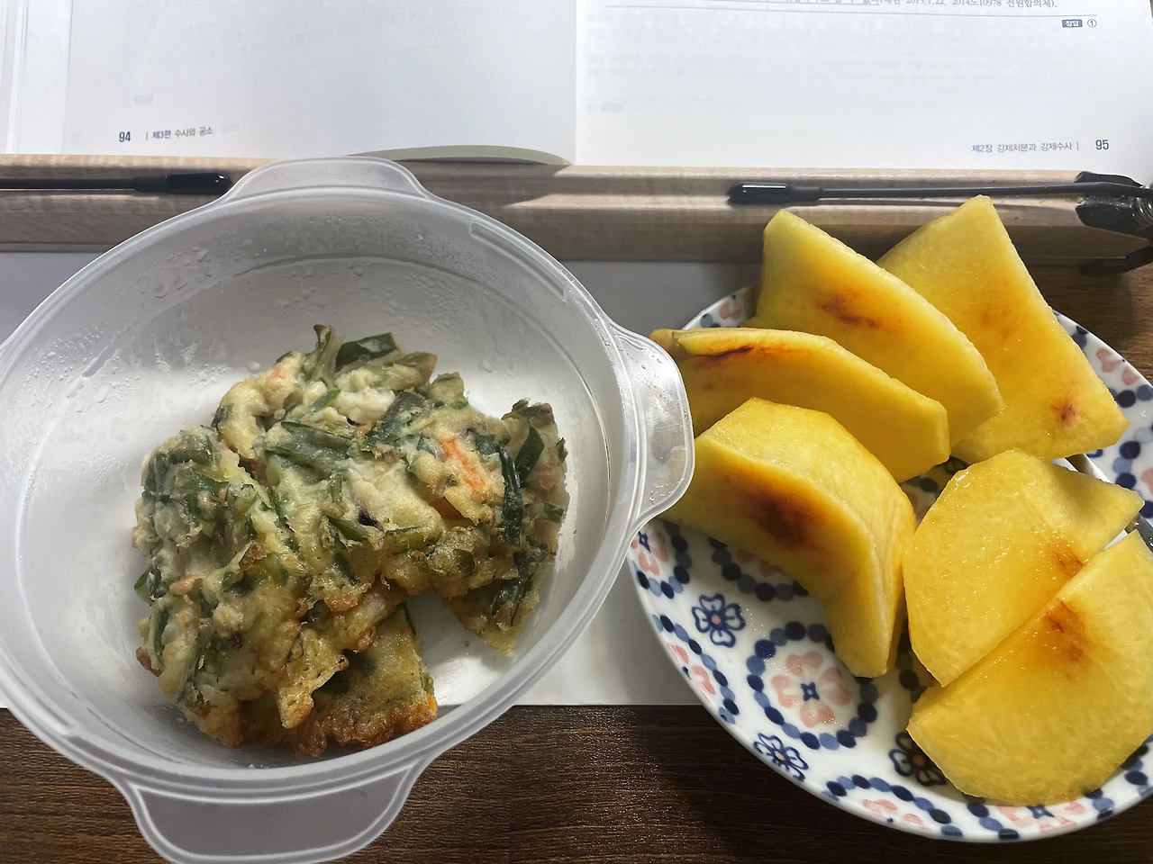 간단하게 해물파전과 복숭아를 저녁으로 먹고