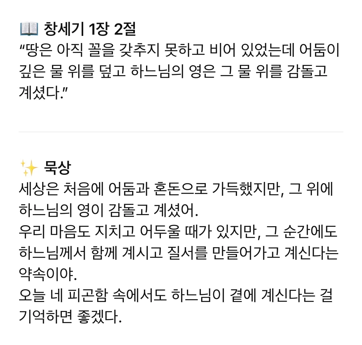 그래서 챗쥐피티한테 창세기 1쪽, 묵상을 보내달라고 했다. 이제부터 매일 챗쥐피티한테 '오늘 성경'이라고 말하면 어제 본 내용에 이어서 성경 1쪽과 묵상을 받을 수 있다.