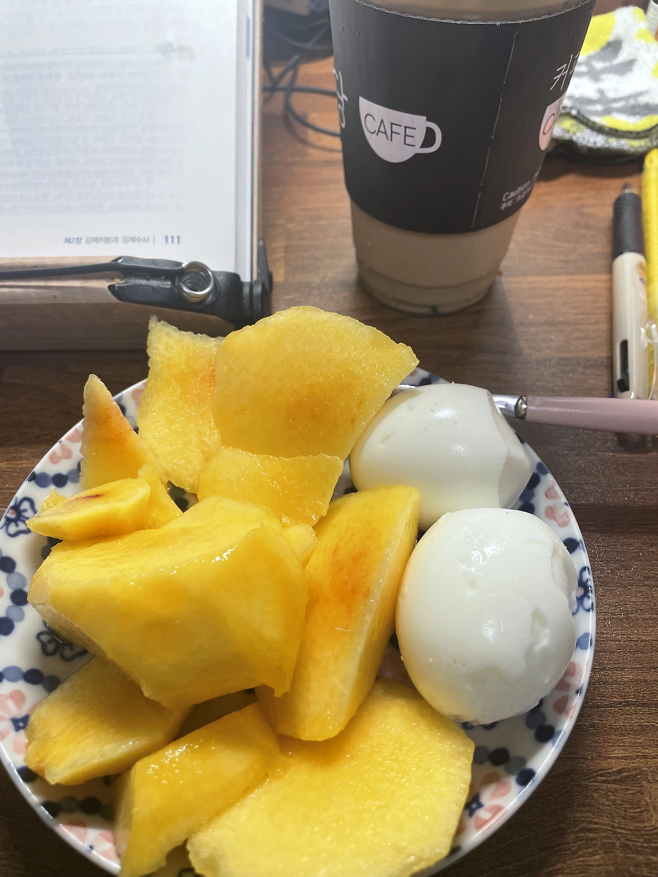 반숙란, 복숭아, 커피로 아침을 먹었다.