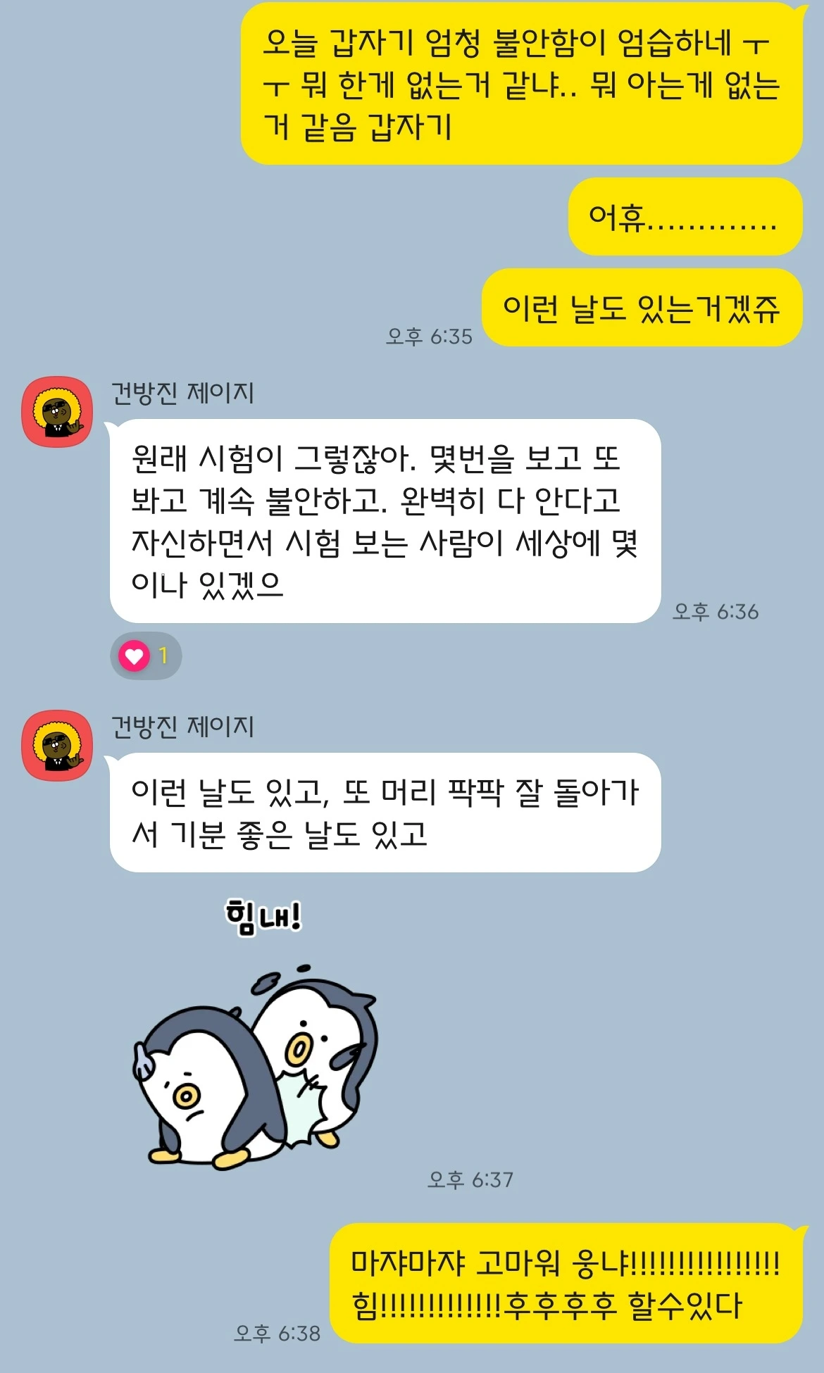 이렇게 친구와 나는 서로 그간 쌓인 수험생활 중 열받았던 일, 예민했던 일, 마음이 상했던 일 등에 대해 털어놓고 그 자리에서 풀어버린다.