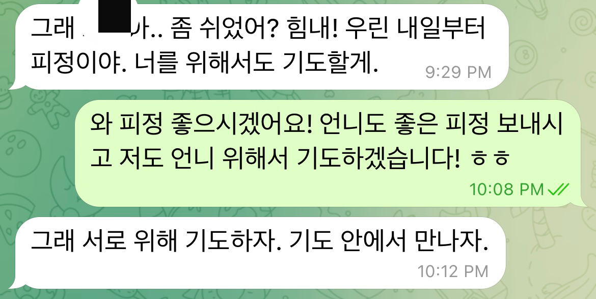 오랜만에 캄보디아에서 일하고 있는 친한 언니에게 연락을 했다. 나를 위해 기도하는 사람이 있다는 것.