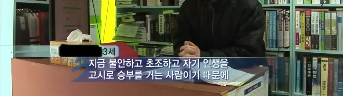 2010년 3월 7일 KBS 다큐3일에서 신림동 고시촌의 모습을 3일간 담은 다큐가 방송되었다. 나는 아주 뒤늦게 변호사의 꿈을 꾸게 된 사람이기 때문에 다큐가 방영될 당시 와 나는 저렇게 못할거 같다. 하며 방송을 봤던 기억이 있다. 유난히 회색빛인 하늘, 무채색 트레이닝 복, 무언가에 쫓기듯이 걷는 바쁜 걸음들..그럼에도 불구하고 아주 흥미진진하게 방송을 보았다.