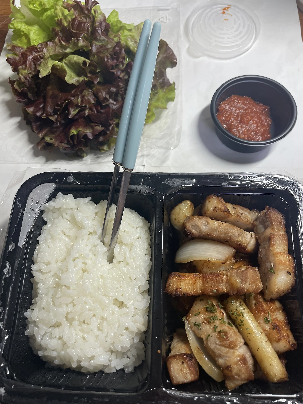저녁은 든든하게 먹어야겠다 싶은데 밖에 나가기엔 또 시간의 압박이 와서 삼겹살을 배달시켰다. (배달음식을 최대한 안 먹으려 했지만 고기는 종종 시켜 먹는다. 혼자 식당에 가서 고기를 구워 먹기엔 아직 쑥스럽다..)