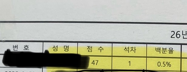 딱 1번 1등을 한 적이 있다. 그날은 최고답안에도 뽑혔었다. 태어나서 1등을 처음 해본 거여서 감격에 겨워 동네방네 자랑을 했었다. 사진까지 찍어뒀었다. 사례형 50점 만점에 47점. 1등!!! (저 맞아요..)