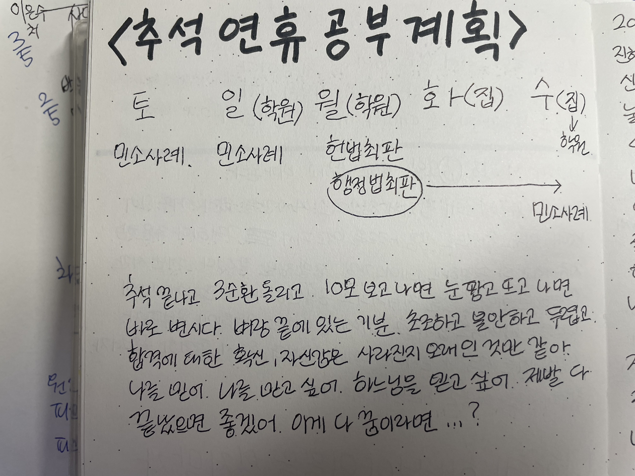 올해는 추석 연휴 계획을 좀 더 촘촘하게 세워봐야겠다. 그리고 본가에 가지 말고 학원에 붙어있어야겠다. 학원 문 닫는 날에는 스터디카페에 가서 공부를 해야겠다. 혼자 하면 풀어질 가능성이 높으니 스터디를 구성해서 서로 공부 계획을 어느 정도 지켰는지 감시해 주기로 해야겠다.
