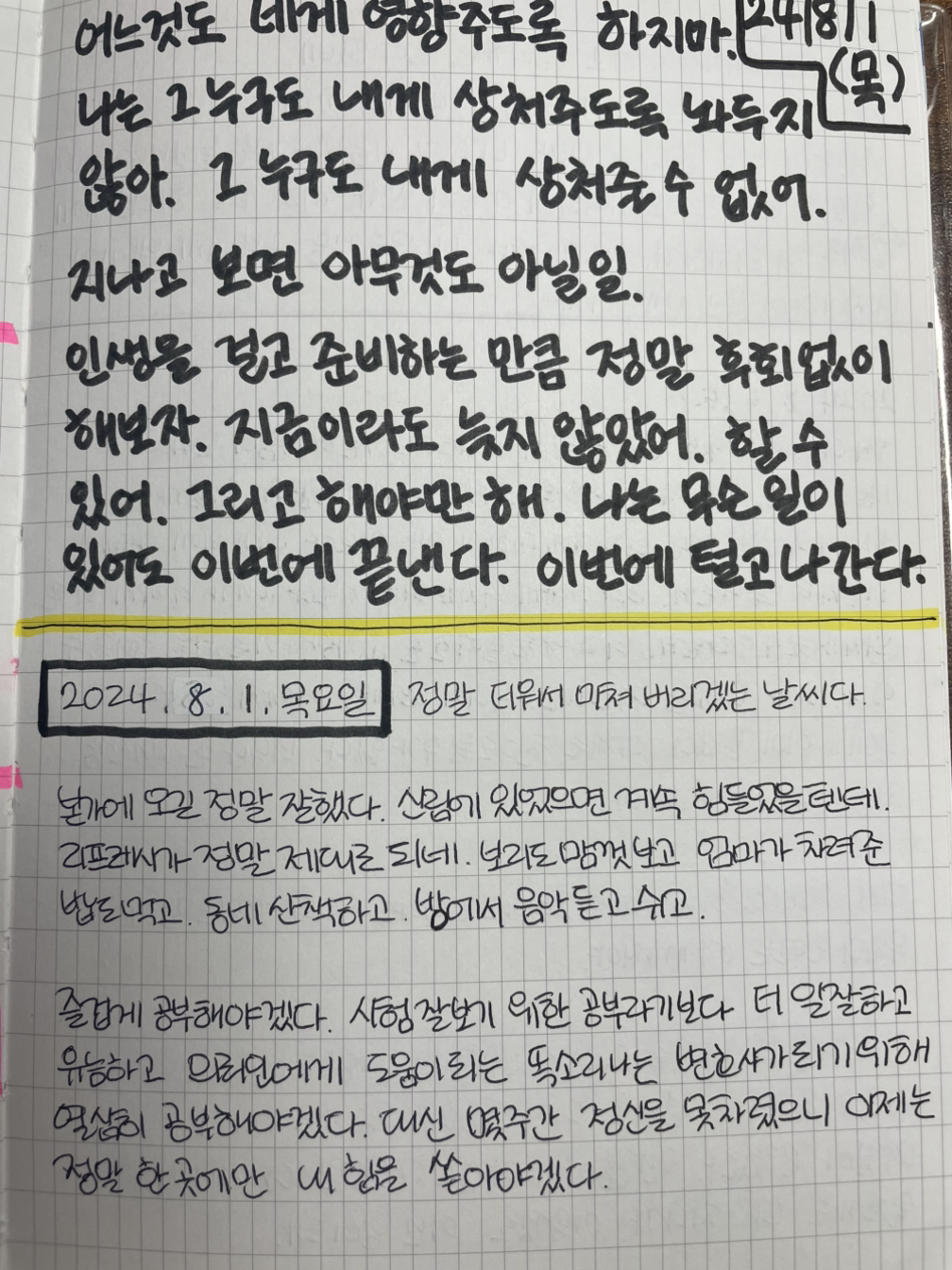 차라리 꿈이었으면 좋겠다고 생각할 정도로 저 당시 많이 힘들었나 보다. 사실 마지막 도전인 지금보다 작년이 멘탈적으로 훨씬 더 힘들었다. 삼시 때 정말 열심히 했기 때문에 불합격한 것에 대한 후유증이 너무 오래갔고 오 시가 될 수도 있다는 불안감이 항상 있어서 매일 악몽을 꿨던 거 같다. 오 시가 된 지금은 오히려 이판사판이다… 이제 몇 개월만 더 공부하면 결과와는 상관없이 나는 해방이다!라는 생각이 더 많이 든다… 정말 벼랑 끝에 있을 땐 정신승리를 하자! 어차피 주사위는 던져졌고 명확하고 현실적인 목표가 이미 있고 그것을 위해 나는 성실하기만 하면 되니까.