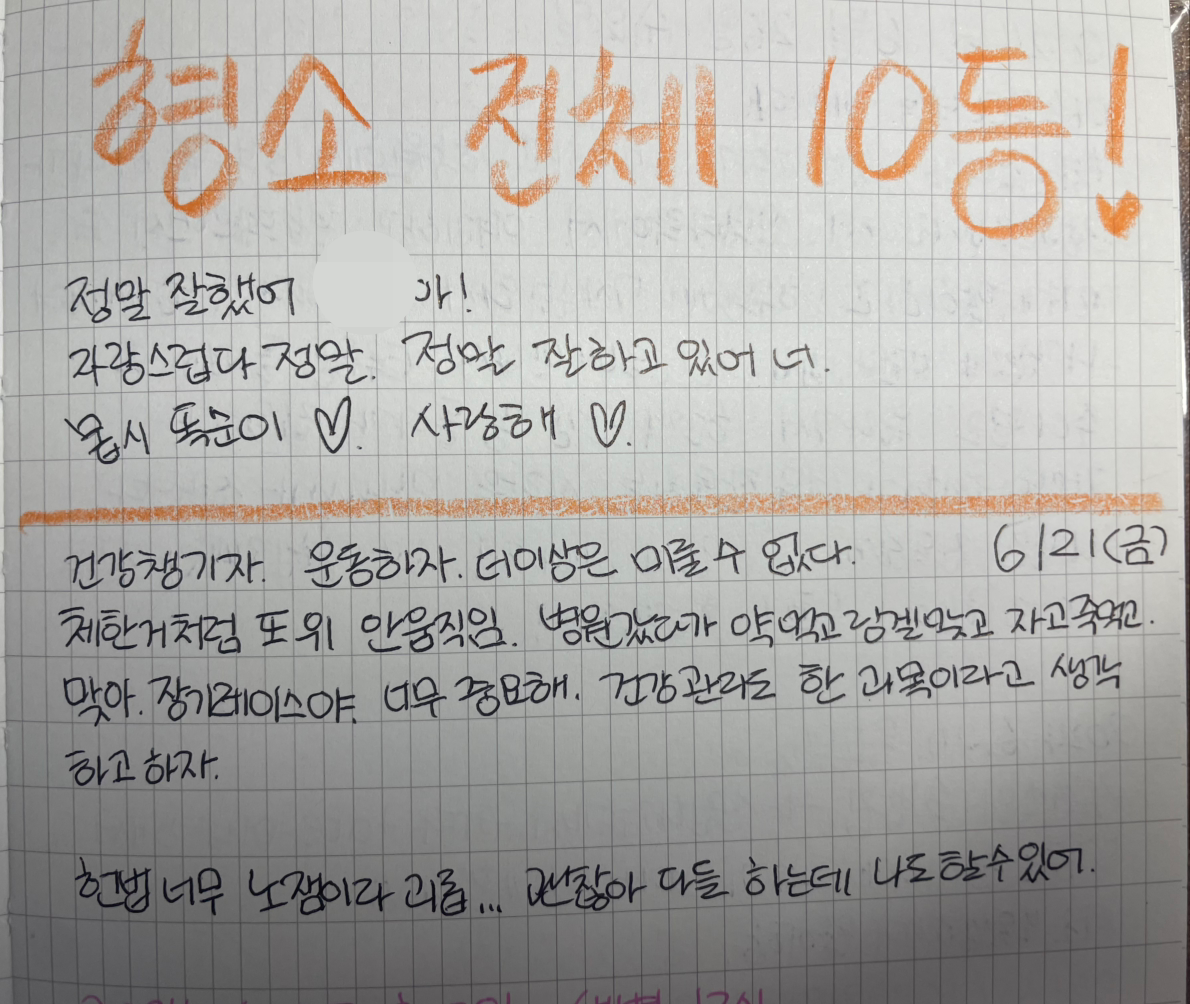 형사소송법 전시험 전체 10등을 하고 자기애가 몹시도 넘쳤던 때였나 보다. 형사법은 내가 제일 좋아하고 그나마 성적도 잘 나오는 과목이다. 끝까지 열심히 하자!!