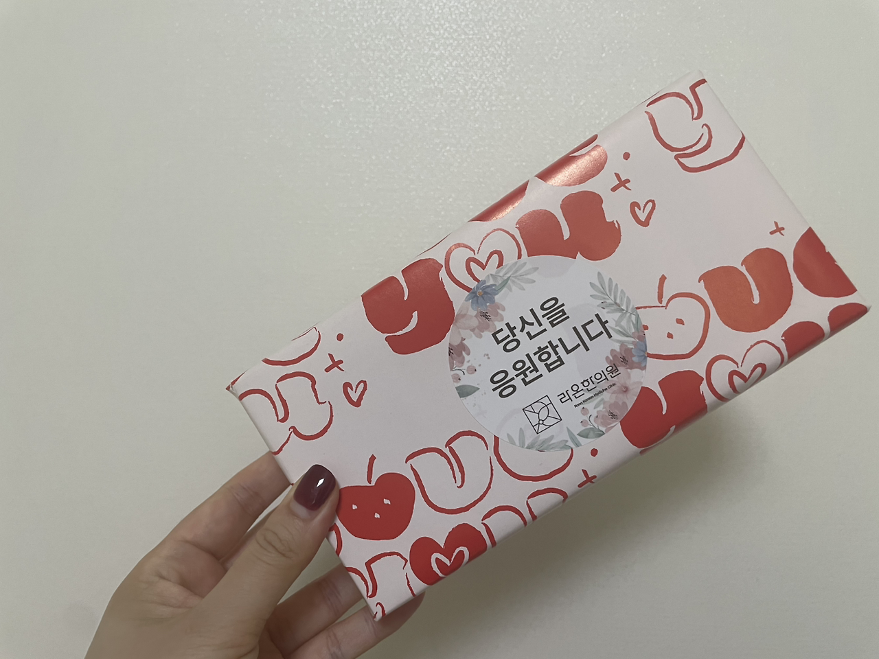 점점 학원 일정이 더 바빠지고 시험이 가까워져서 한의원을 갈 수 없었다. 몇 달간 한의원에 가지 못하고 있던 중 12월 즈음에 한의원에서 문자가 왔다. 00님 시간 되실 때 한의원 들러주세요. 드릴 것이 있습니다. 문자를 받자마자 비타오백을 사들고 한의원에 갔다. 선생님은 예쁘게 포장된 선물을 주셨다. 거기에는 ’ 당신을 응원합니다 ‘라고 적힌 스티커가 붙어 있었다. ’꼭 합격하세요.라고 쓰면 혹여나 부담될까 봐서 응원한다고 썼어요. 시험 잘 보세요~‘ 눈물이 핑 돌았다. 아무리 단골이라고 해도 이렇게까지 챙겨주시다니. 합격을 하고 다시 찾아오겠다고 말했다.