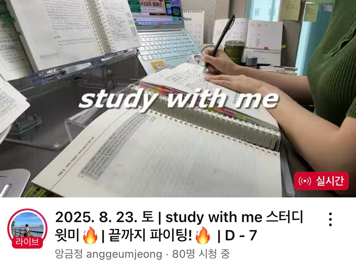 요즘 스터디윗미 라이브 스트리밍을 하는 분의 영상을 보며 같이 공부하고 있다. 장작불 asmr이 깔려서 거슬리지 않고, 순공시간을 하루에 13시간(!!!!!)을 찍어버리는 무시무시한 분이어서 자극받으려고 그분의 영상을 보기 시작했다.