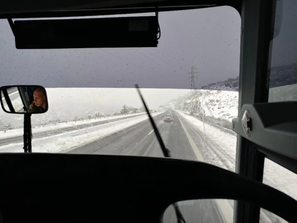 한창 타고 가는데 눈이 오더라. 그리스도 눈이 오는구나 싶어서 댄따 신기했다. 나름 제설차도 이미 지나간 후였다. 바다랑 떨어져서 그런지 펠로폰네소스지방이 원래 좀 많이 춥나보다. 아테네를 생각하면 전혀 눈이 올 날씨가 아니던데. 누군가 그랬던 것 같은데 아테네에서 눈은 정말 간혹가다 오고 눈이 오는날은 단체로 휴교를 한다고. 그 이유인즉슨 아테네는 인도가 대리석이라 눈오면 엄청 미끄럽다고 했다. 아니.. 그 비싼 대리석이라뇨!! 실내도 아니고 인도에 대리석이라뇨!!