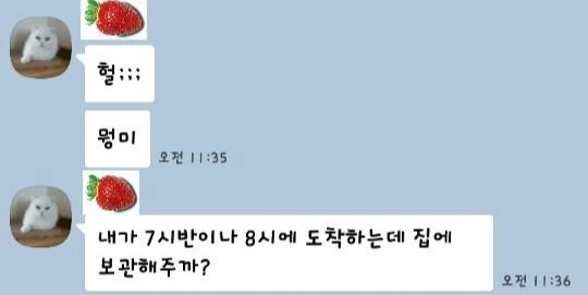 "ㅇㅇ 내가 가져다가 우리집 김치냉장고에 넣어둘게. 도착하면 문자주셈. 경비실 들를게."
