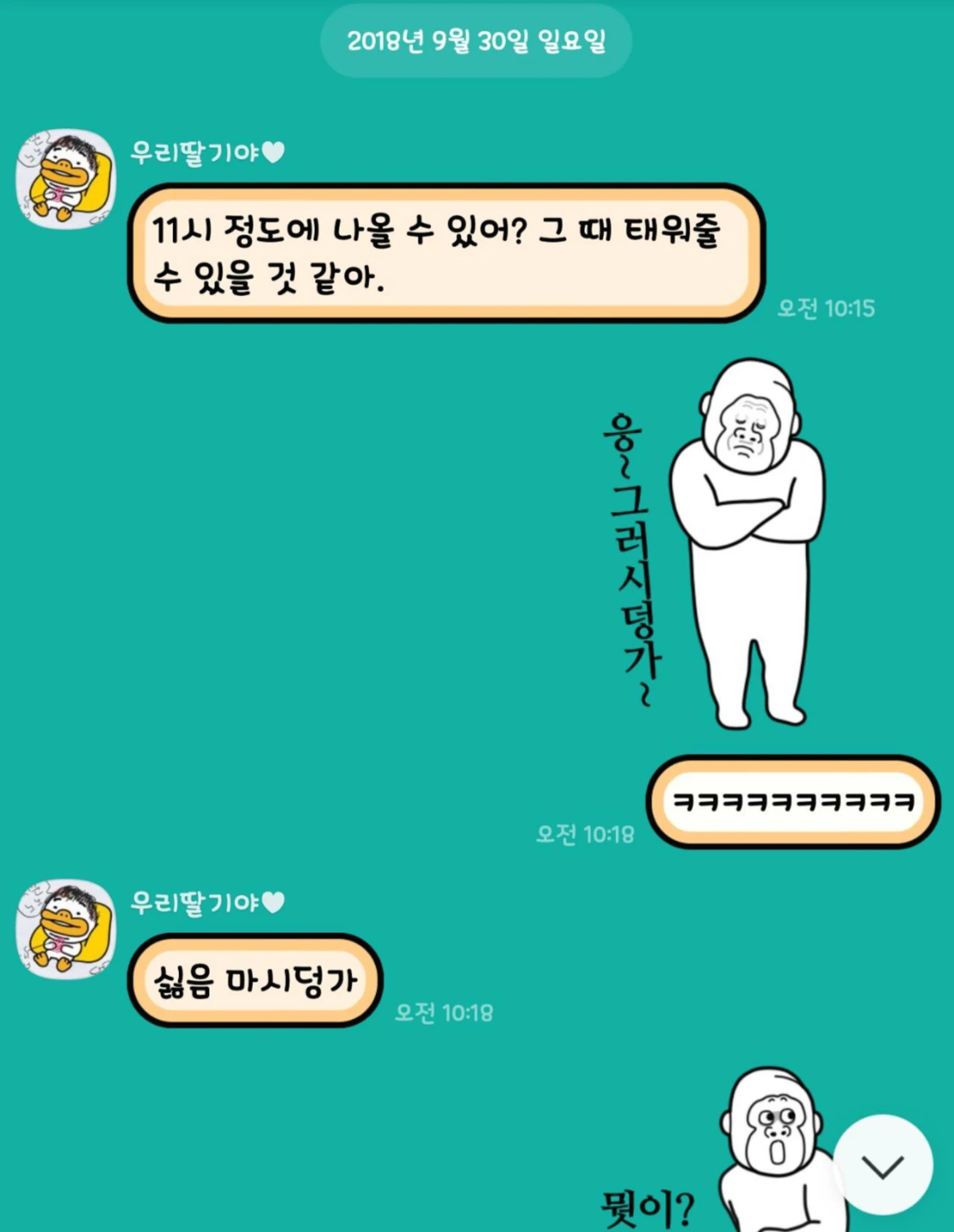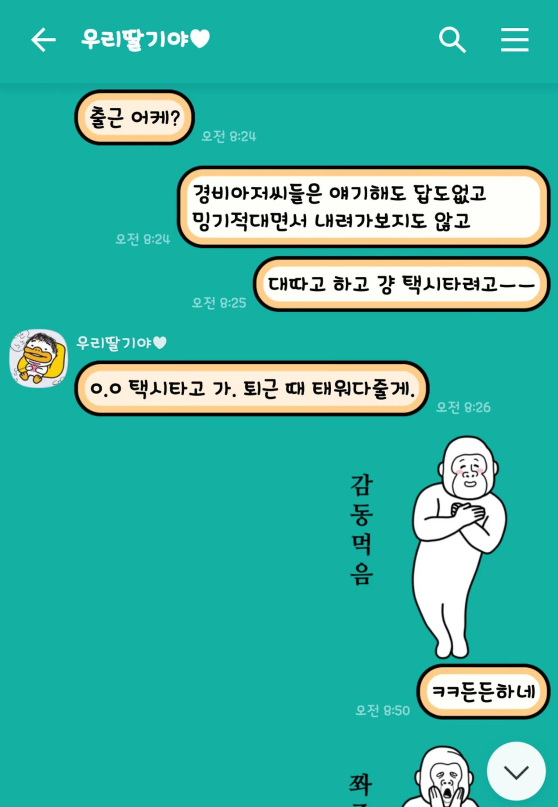 사실 저 감동먹은 이모티콘은 참으로 고심한 끝에 선택한 것이다. 원래 오렌지씨는 저런 닭살 이모티콘(저 정도가지고?ㅋㅋㅋㅋㅋ)을 즐겨쓰는 사람이 아니다. 사실 후배밀미리뽕의 조언에 따라 반강제적으로 찍었... 앞 대화와의 시간차를 보라..