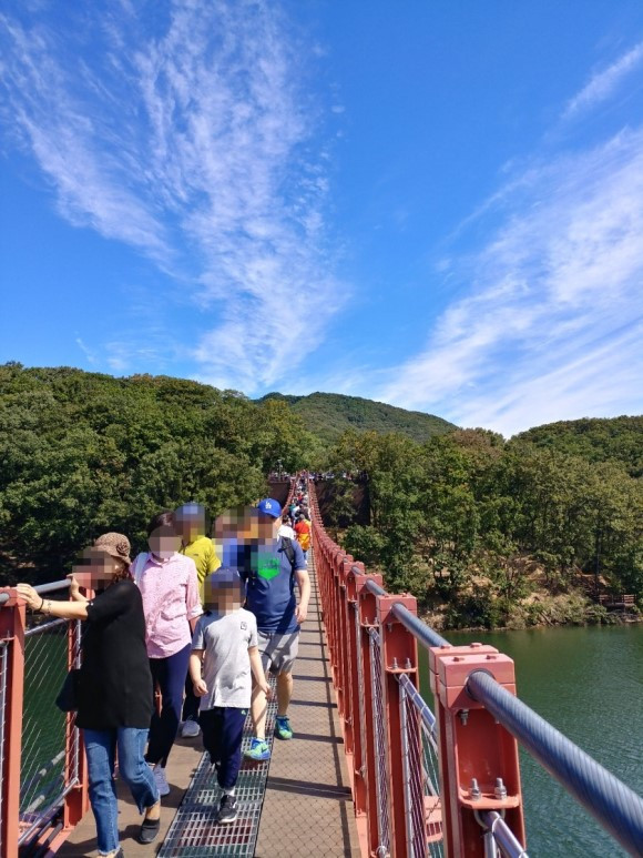 추석연휴를 맞아 나들이들을 나오셨는지 사람들이 꽤 많았다. 그리고 마장호수의 명물은 단연 호수를 가로지르는 출렁다리이다.