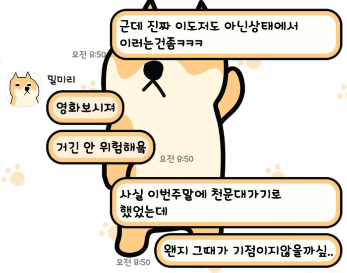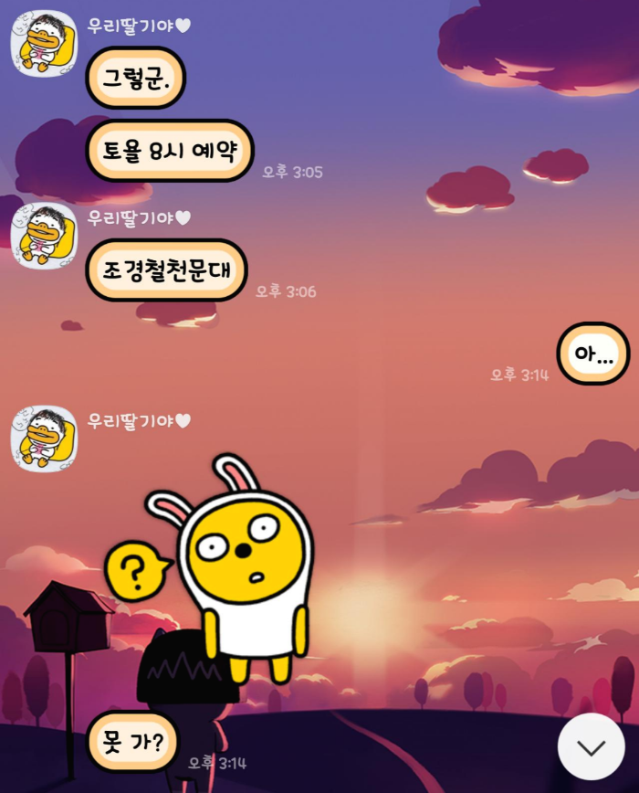 그냥 동네친구였다면 그러려니 하고 패스했겠지만 이미 둘 사이에서 무언가가 꿀렁꿀렁 꾸잉꾸잉 올라오고 있는 상황에서의 저런 이모티콘은... 아무래도 의식하게 되기 마련.