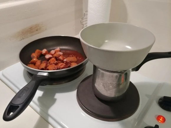 오징어캔을 반신반의하며 뜯었는데 정말 먹을만 했다. 스파이시라고 적혀있어서 양념이 되어있을거라고 생각은 했었는데 쏘세지랑 같이 넣고 볶으니 역시나 훌륭한 반찬이 되었다. 밥은 그냥 냄비에 해야되나 하다가 스프를 끓이는 포트인건지... 여튼 적당한게 보여서 저 작은 포트에 딱 1인분만 하기로 했다. 뚜껑이 없는 것 같아서 대접을 대신 사용했다. 결과는 성공.