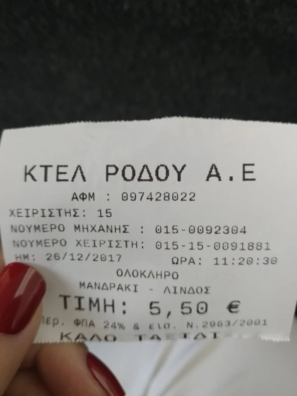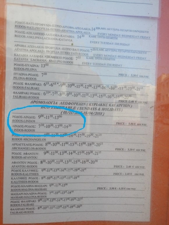 "지금은 휴일이야. 오늘은 26일인데 왜 휴일인건지.. 근데 기사가 오늘도 휴일이래. 참 이상하지? 어쨌든 로도스에서 린도스는 아침 9시, 11시30분, 13시에 출발하고, 돌아오는 버스는 7시30분, 10시30분, 13시, 14시30분에 있네"