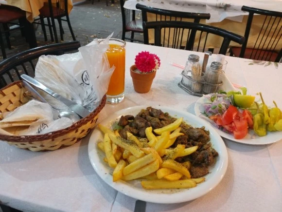 그러다 머릿속에 불이 번쩍하면서 깨닫게 되었는데 내가 앉아있는 곳이 아랍인들인지 인도인들인지 내 능력으로는 구분이 안되는, 여튼 그리스사람이 아닌 분들이 모여서 사는 곳이었던 것. 어쩐지 그래서 식당이고 뭐고 간판에 아랍어가 써 있었던 거구나. 오모니아는 이런 곳이었구나 하는 생각이 든다. 그나저나 내 음식은.. 바로 나오긴 했는데 난 분명 치킨을 시킨것 같은데 뭐가 이렇게 퍽퍽한 거냐.. 이것의 정체는 몇 개 더 주워먹어보고 알게 되었다. 간이다.....간이라고요.... 치킨 간인가 보오... 살다살다 내가 치킨 간도 먹어보는 구나. 퍽퍽해서 진짜 억지로 억지로 넘나 미안해서 다 남기지는 못하고 눈물을 머금고 꾸역꾸역 반 정도 먹고 마무리했다. 그리고 이 나라도 뭔가 음식을 시키면 샐러드랑 튀긴감자랑 빵을 엄청 준다. 배터지겠다. 결론은 근데 샐러드가 제일 맛있었다..쿨럭.. 나는 그렇게 그리스에서 아랍식 식사를 했다.