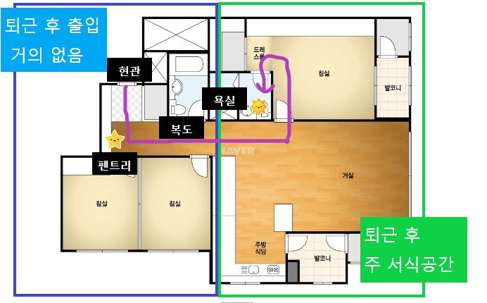 욕실 휴지를 보급하는 최적의 루트는 퇴근하면서 팬트리에 들러 휴지를 꺼내 가져오는 것이다. 퇴근 후 출입을 거의 하지않는 복도구역에 굳이 가지 않기 위한 최선의 방법.