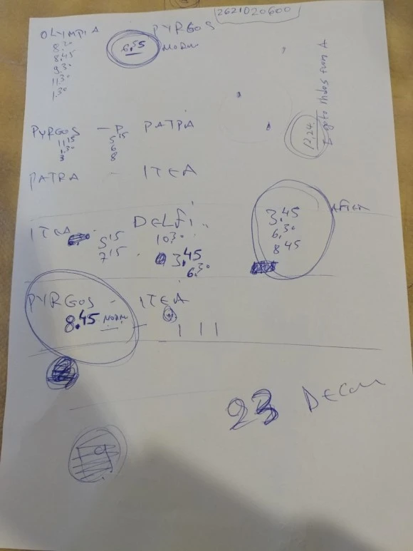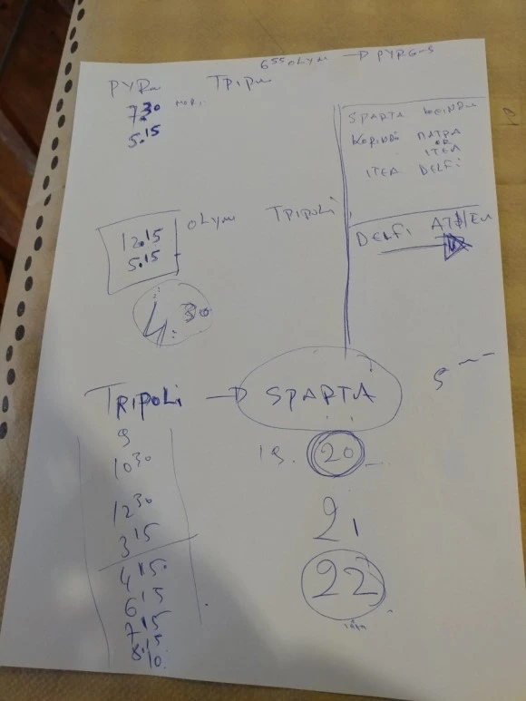 혹시나 하여 올림피아 집에 돌아갈까하다 식당주인겸 쉐프겸 웨이터인 아재한테 여쭙는다. 여기서 델피(델포이) 갈 수있냐고 또는 스파르타 갈수 있냐고. 사실 정말 진짜 아무생각없이 물어본거였음. 그냥 막연히 피르고스로 돌아가서 다시 코린도스까지 이동하여 거기서 미케네를 가는 방법을 찾아보고 되면 가고 안되면 아테네로 돌아가야하나 하는 막연한 생각을 하던 중이었으므로. 그리고 뭐 이따 시간이 되면 지도보고 더 연구할 생각이었으므로. 근데 넘나 이렇게 친절하게 적어주셨다. 버스터미널에 손수 한번도 아니고 여러번 전화해가시면서 꽤 오랜시간동안 나를 위해 정보를 찾아주시는 아저씨. 식당주인겸 쉐프겸 웨이터겸 여행사 직원인 아저씨 넘나 감사했다능!! 내일아침도 꼭 여기서 먹겠어요!
