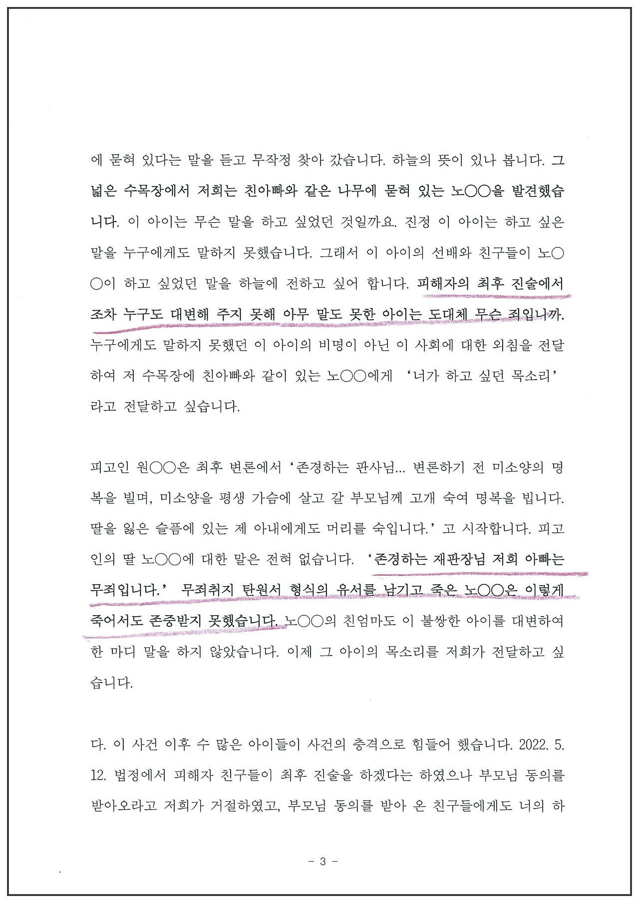 피고인 원○○은 최후 변론에서‘존경하는 판사님... 변론하기 전 미소양의 명복을 빌며, 미소양을 평생 가슴에 살고 갈 부모님께 고개 숙여 명복을 빕니다. 딸을 잃은 슬픔에 있는 제 아내에게도 머리를 숙입니다.’고 시작합니다. 피고인의 딸 노○○에 대한 말은 전혀 없습니다. ‘존경하는 재판장님 저희 아빠는 무죄입니다.’ 무죄취지 탄원서 형식의 유서를 남기고 죽은 노○○은 이렇게 죽어서도 존중받지 못했습니다. 노○○의 친엄마도 이 불쌍한 아이를 대변하여 한 마디 말을 하지 않았습니다. 이제 그 아이의 목소리를 저희가 전달하고 싶습니다.