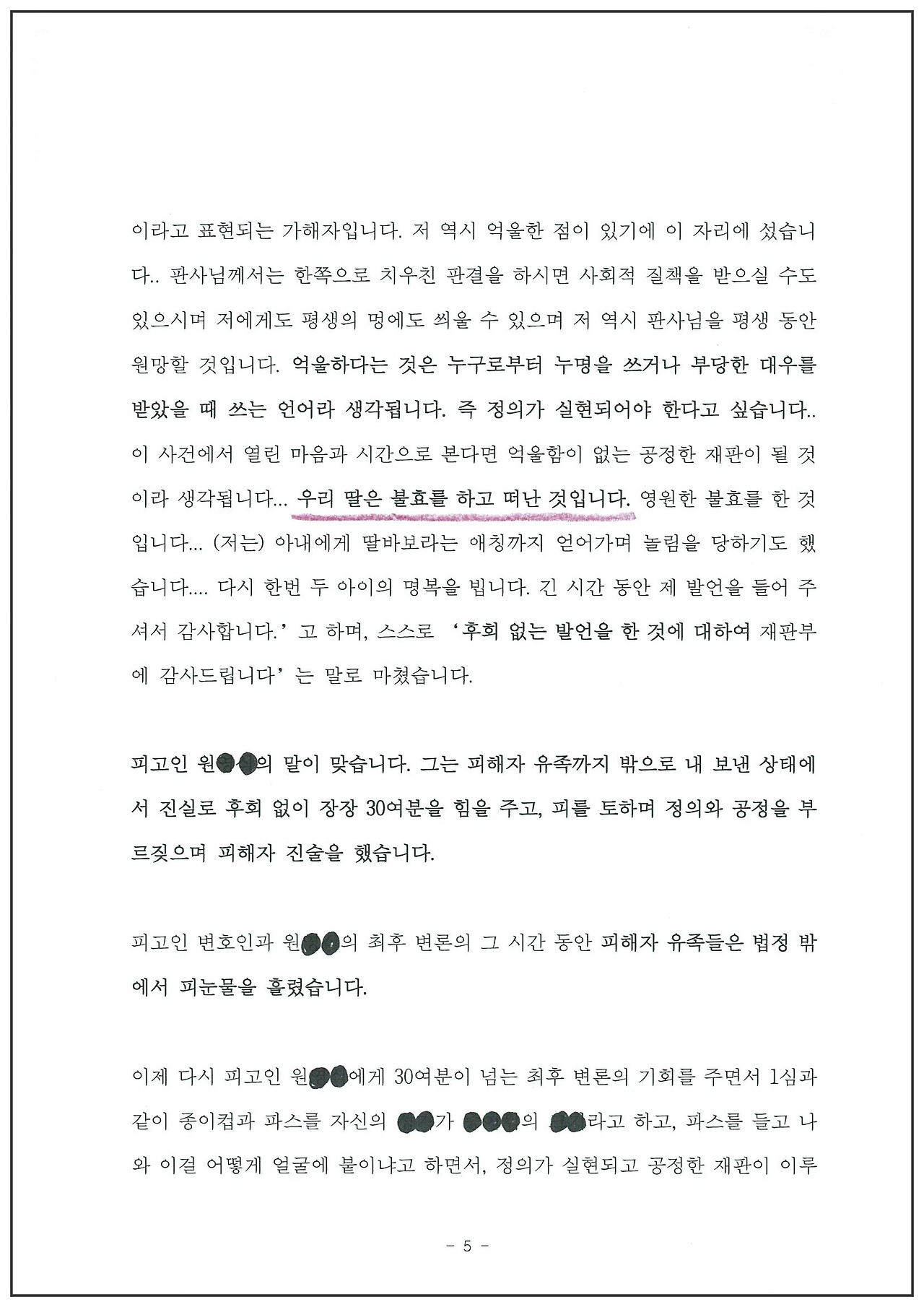 마. 또한 2021. 12. 10. 방청객은 물론 피해자 유족들조차 모두 법정 밖 복도로 나간 상태에서 피고인 원○○은 자유롭게 피고인 최후변론을 혼자서만 30여분을 하였습니다. 그 내용 중 일부를 보면 ‘각종 언론에서 이야기하는 나쁜 놈이라고 표현되는 가해자입니다. 저 역시 억울한 점이 있기에 이 자리에 섰습니다.. 판사님께서는 한쪽으로 치우친 판결을 하시면 사회적 질책을 받으실 수도 있으시며 저에게도 평생의 멍에도 씌울 수 있으며 저 역시 판사님을 평생 동안 원망할 것입니다. 억울하다는 것은 누구로부터 누명을 쓰거나 부당한 대우를 받았을 때 쓰는 언어라 생각됩니다. 즉 정의가 실현되어야 한다고 싶습니다.. 이 사건에서 열린 마음과 시간으로 본다면 억울함이 없는 공정한 재판이 될 것이라 생각됩니다... 우리 딸은 불효를 하고 떠난 것입니다. 영원한 불효를 한 것입니다... (저는) 아내에게 딸바보라는 애칭까지 얻어가며 놀림을 당하기도 했습니다.... 다시 한번 두 아이의 명복을 빕니다. 긴 시간 동안 제 발언을 들어 주셔서 감사합니다.’고 하며, 스스로 ‘후회 없는 발언을 한 것에 대하여 재판부에 감사드립니다’는 말로 마쳤습니다.
