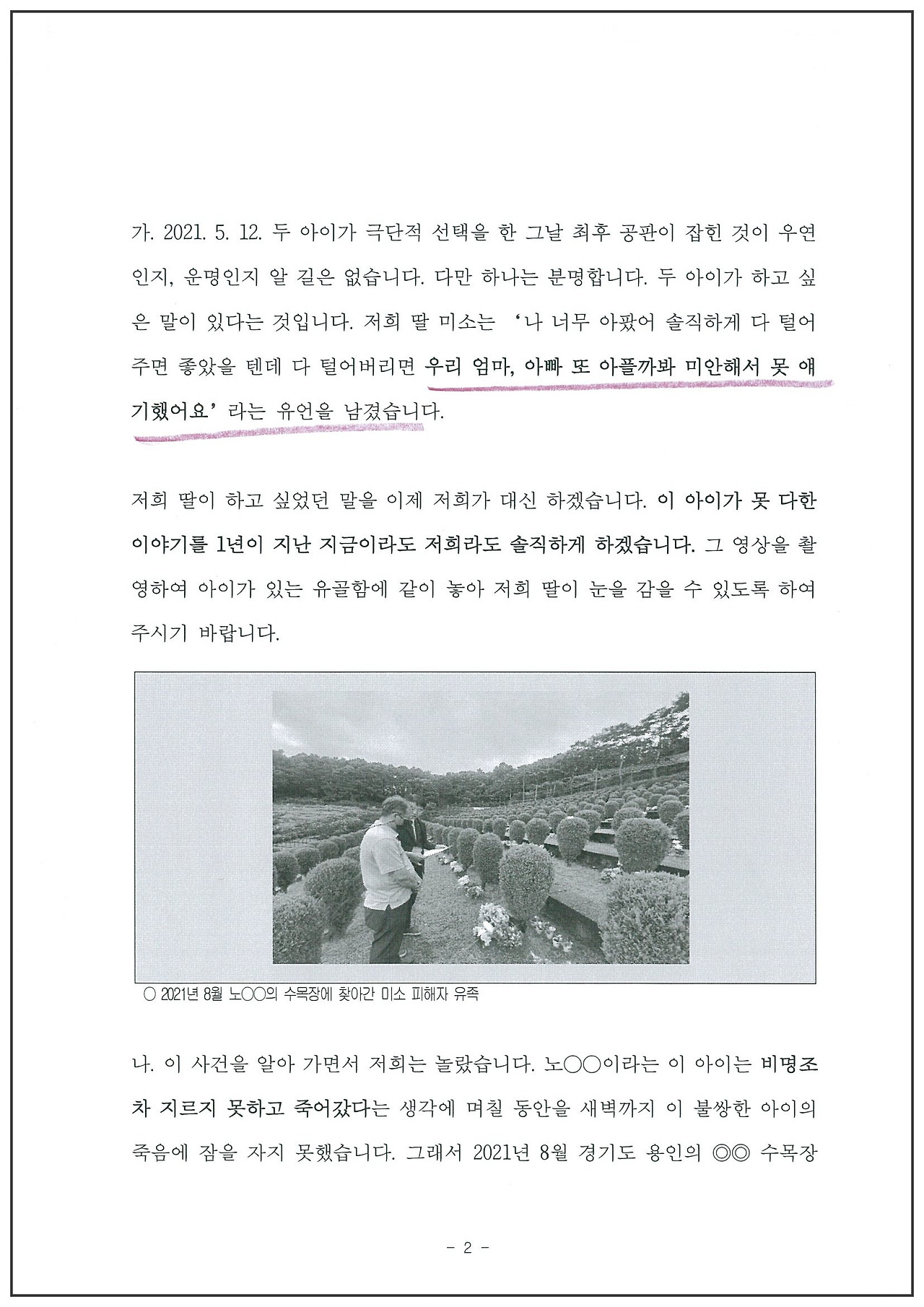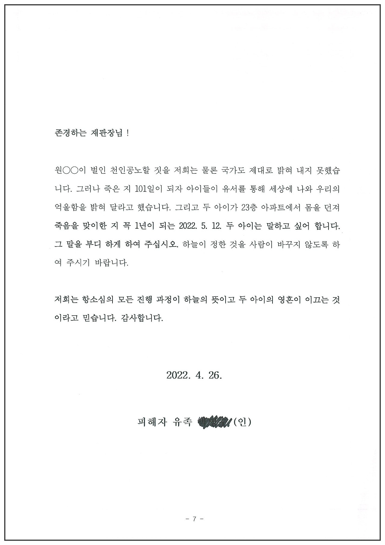 원○○이 벌인 천인공노할 짓을 저희는 물론 국가도 제대로 밝혀 내지 못했습니다. 그러나 죽은 지 101일이 되자 아이들이 유서를 통해 세상에 나와 우리의 억울함을 밝혀 달라고 했습니다. 그리고 두 아이가 23층 아파트에서 몸을 던져 죽음을 맞이한 지 꼭 1년이 되는 2022. 5. 12. 두 아이는 말하고 싶어 합니다. 그 말을 부디 하게 하여 주십시오. 하늘이 정한 것을 사람이 바꾸지 않도록 하여 주시기 바랍니다.