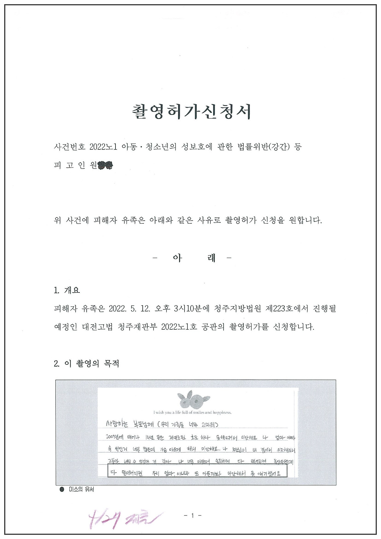 피해자 유족은 2022. 5. 12. 오후 3시10분에 청주지방법원 제223호에서 진행될 예정인 대전고법 청주재판부 2022노1호 공판의 촬영허가를 신청합니다.
