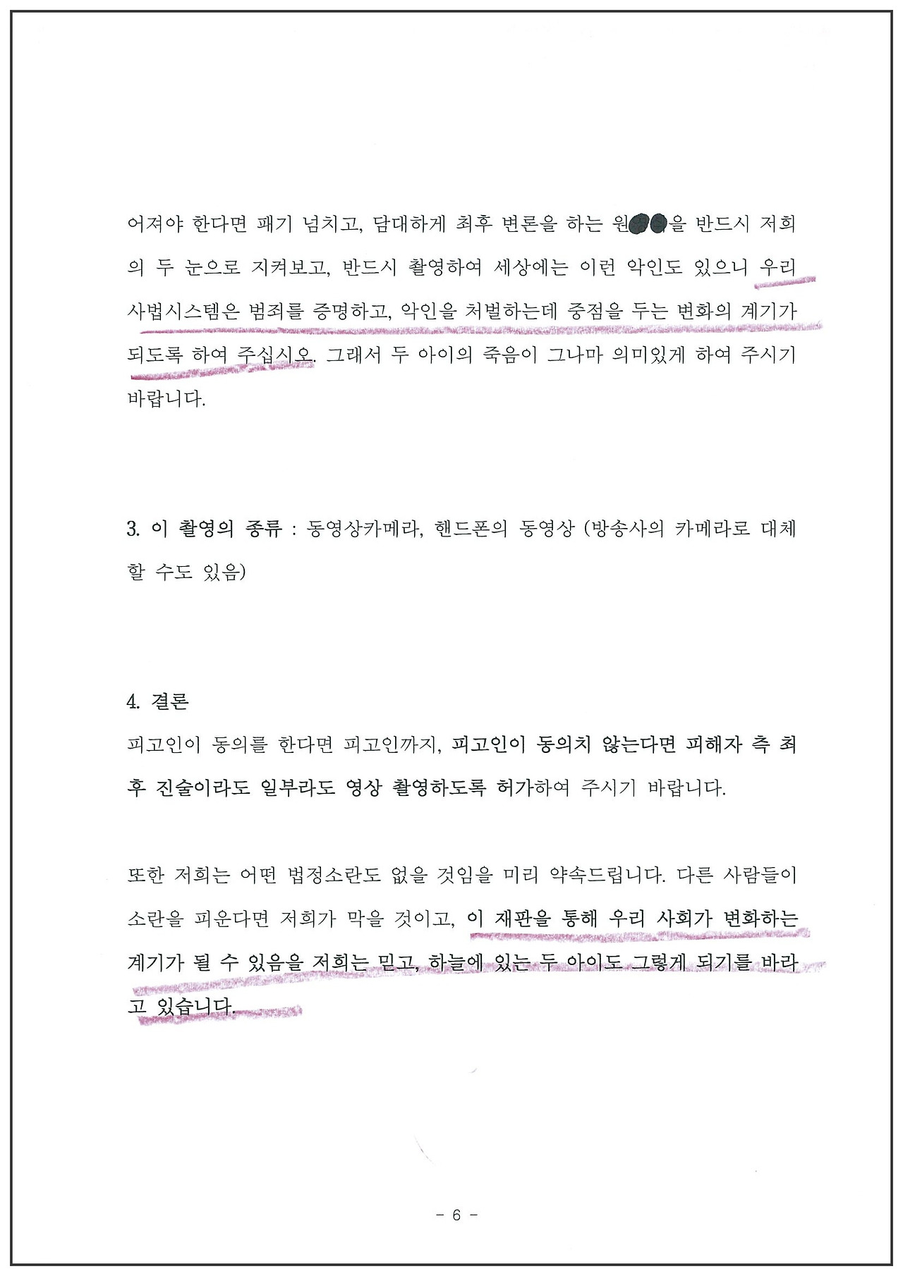 이제 다시 피고인 원○○에게 30여분이 넘는 최후 변론의 기회를 주면서 1심과 같이 종이컵과 파스를 들고나와 이걸 어떻게 얼굴에 붙이냐고 하면서, 정의가 실현되고 공정한 재판 이루어져야 한다면 패기 넘치고, 담대하게 최후 변론을 하는 원○○을 반드시 저희의 두 눈으로 지켜보고, 반드시 촬영하여 세상에는 이런 악인도 있으니 우리 사법시스템은 범죄를 증명하고, 악인을 처벌하는데 중점을 두는 변화의 계기가 되도록 하여 주십시오. 그래서 두 아이의 죽음이 그나마 의미있게 하여 주시기 바랍니다.