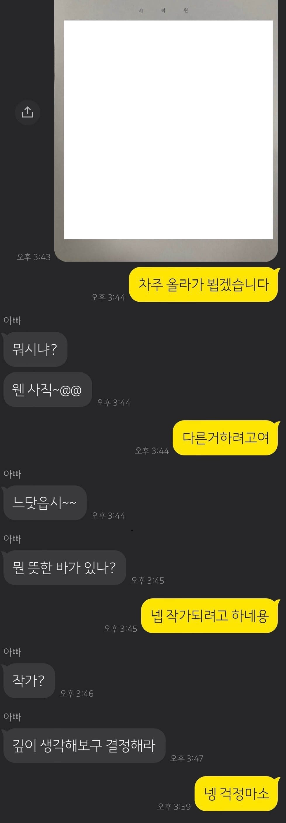 결국 3년 뒤, 진짜 퇴사를 할 땐 부모님과 논의는 개뿔 언질도 주지 않고, 카톡으로(...) 사직서를 찍어서 보내드렸다.(....)