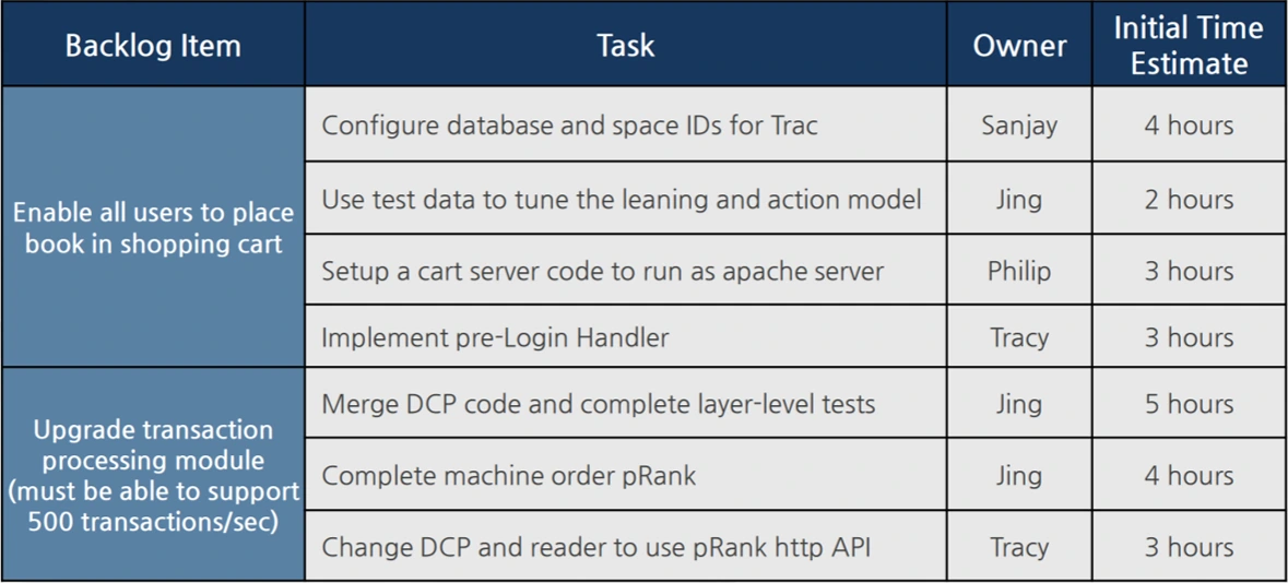 각 스프린트 목표에 도달하기 위해서 필요한 작업 목록이다. 각 주기에서 개발할 작업 목록을 의미하며 세부적으로 어떤 것을 구현해야 하는지 작업자는 누구인지 작업 시간은 어느 정도인지를 세우게 된다.