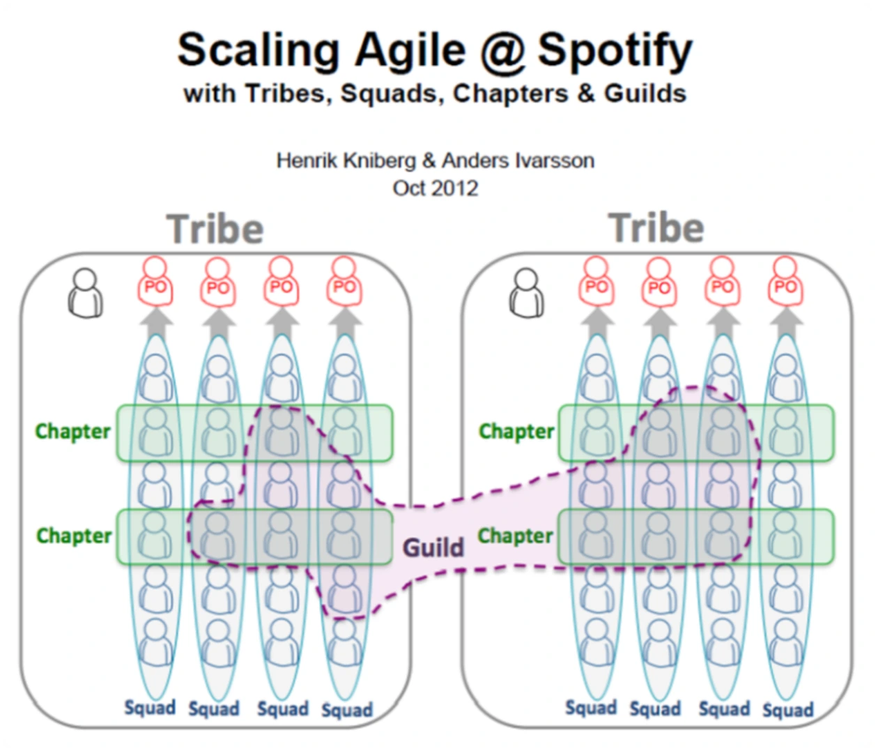 길드는 오픈 커뮤니티로서 누구나 가입과 탈퇴가 가능하다. 관심에 따라 여러 길드에 가입할 수도 있다. 2012년 도입 시 길드의 원래 목적은 트라이브 간에 전문성을 융합하기 위한 것이었으나 이제는 그 이상으로 발전하여 공통 관심사를 지닌 구성원의 이해 공동체가 되었다. 자바 길드, C++ 길드, 또는 안드로이드 길드와 같은 업무 관련 길드가 있을 뿐 아니라 공예, 양조장, 사진 길드와 같은 취미 관련 길드도 있다. 챕터는 트라이브 내에서 조직되고 운영되지만, 길드는 일반적으로 전체 조직을 가로지른다. 동일한 범위의 지식과 도구, 코드 및 관행을 공유하고자 한다면 누구나 모일 수 있다.