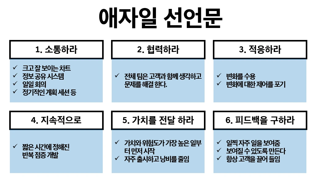 프로세스나 툴보다는 개인과 상화 작용을 더 우선시하고, 복잡한 문서화보다는 동작하는 소프트웨어에 더 집중하여야 하며, 계약과 협상보다는 고객과의 협업이 더 우선이 되어야 한다. 계획대로 수행하는 방식보다 상황에 따른 변화에 민첩하게 진행되어야 한다.