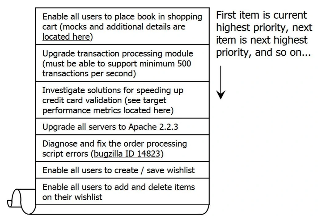 사용자의 요구사항 목록이라고도 할 수 있으며 결정된 제품 기능 목록은 확정된 것이 아니라 개발 중이라도 수정이 가능하지만 웬만하면 한 번의 주기가 끝나기 전까지는 수정하지 않는다.