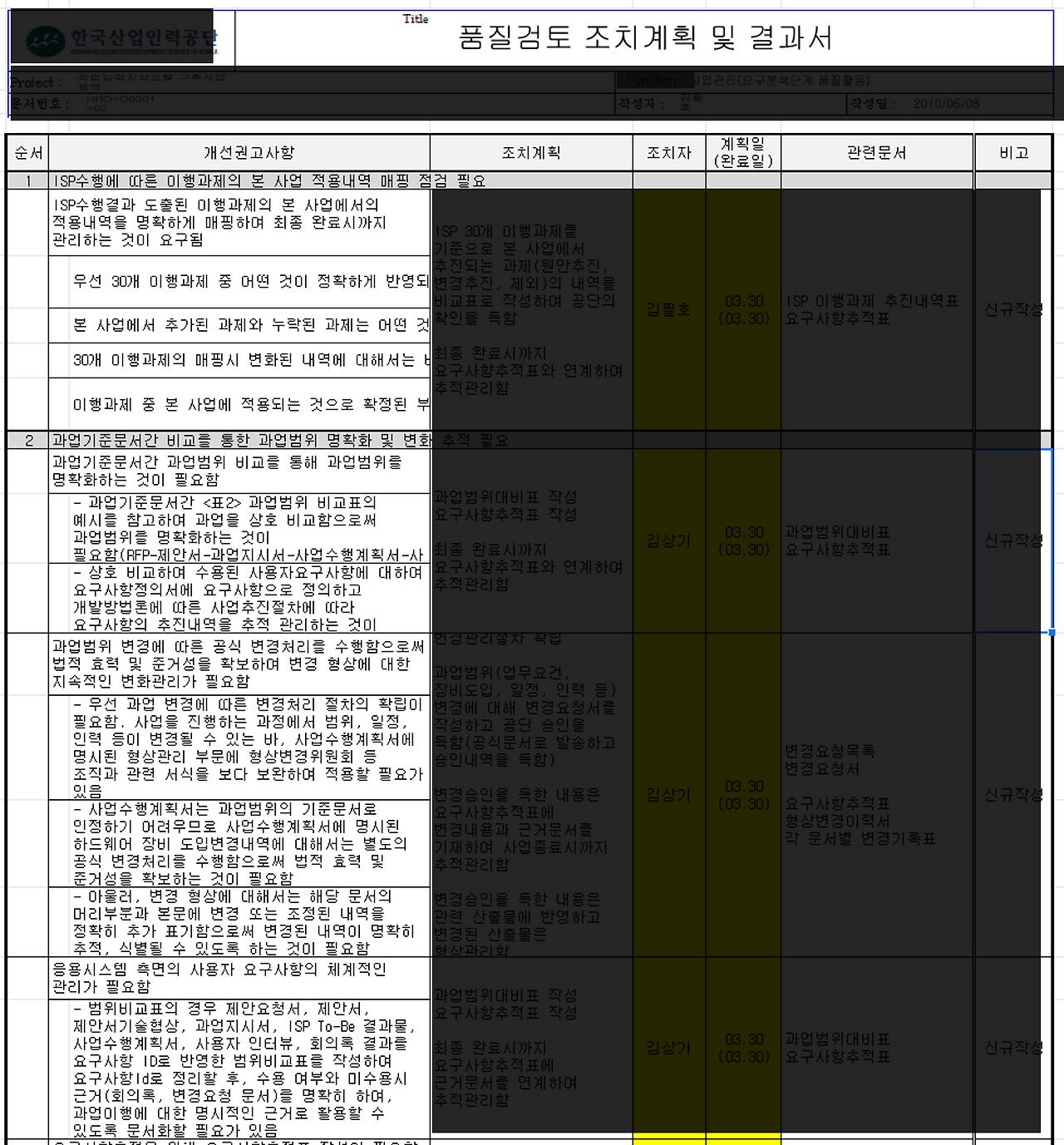 품질 검토 단계에서 개선이 필요한 내용들을 명시하고 개선 권고사항을 작성하는 문서입니다.