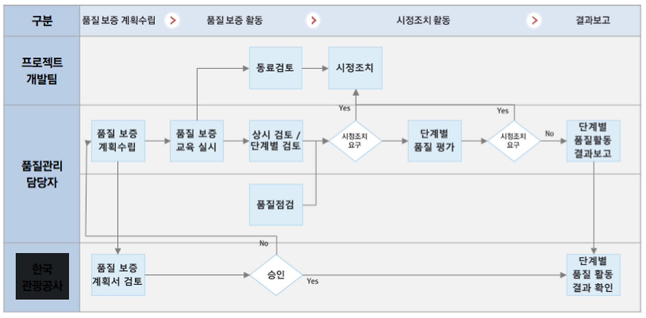 품질활동의 계획과 일정이 표현되어야 하고 진행하는 절차별 산출물을 나열합니다.