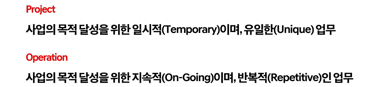 프로젝트는 사업의 목적 달성을 위한 일시적(Temporary)이며, 유일한(Unique) 업무를 말하고 오퍼레이션(운영 업무)은 사업의 목적 달성을 위한 지속적(On-Going)이며, 반복적(Repetitive)인 업무를 말합니다. 프로젝트는 일시적인 일정을 갖고 유일한 업무를 진행하는 반면 오퍼레이션(운영 업무)은 지속적인 일정과 반복적인 업무를 진행합니다.