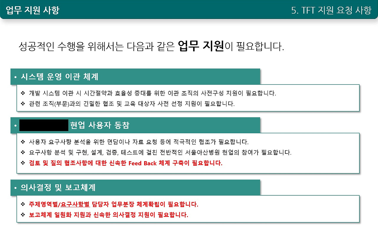 진행했던 프로젝트의 착수보고서(수행계획서)에서 아래와 같이 현업 사용자의 동참, 의사결정/보고체계 등의 업무 지원요청을 결정권자에게 보고 하여 요청하였습니다.