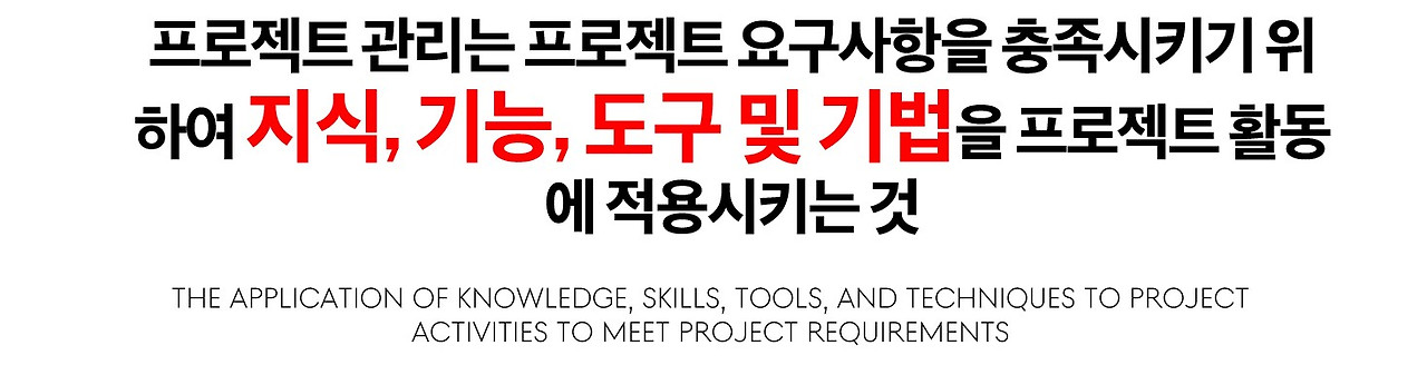 PMBOK에서 프로젝트 관리를 “프로젝트 관리는 프로젝트 요구사항을 충족시키기 위하여 지식, 기능, 도구 및 기법을 프로젝트활동에 적용시키는 것”이라고 정의합니다.