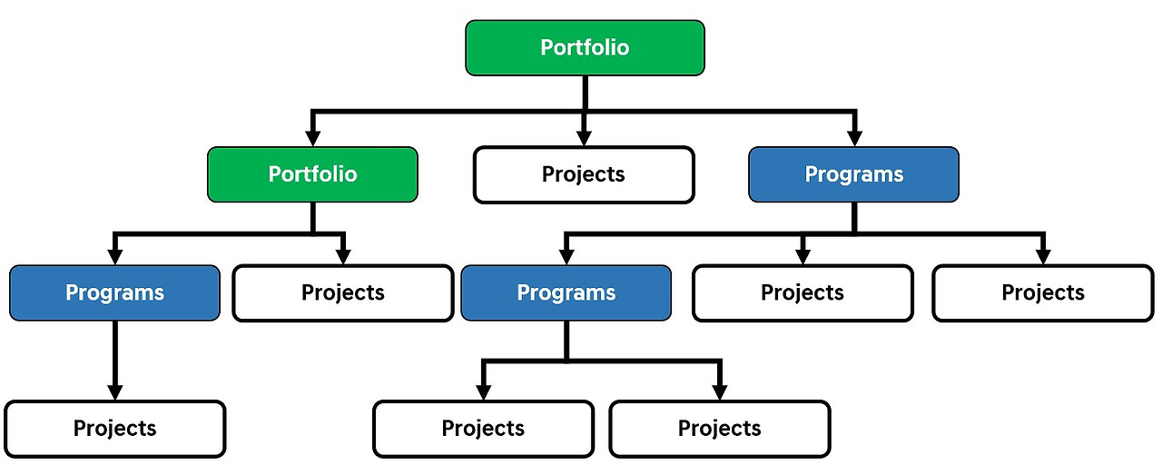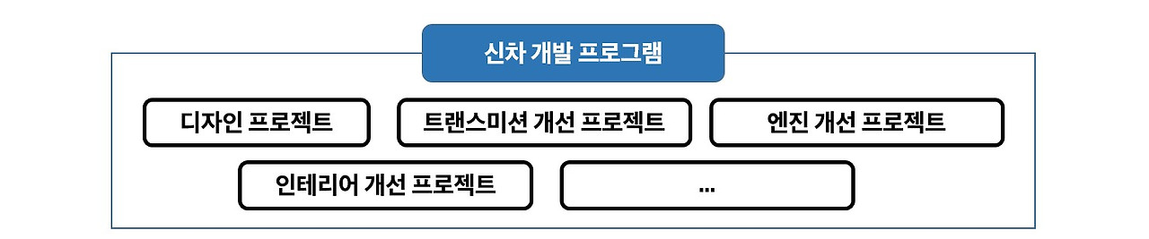 아래의 예시는 신차 개발 프로그램 하위에 공통적인 디자인 프로젝트, 트랜스미션 개선 프로젝트, 엔진 개선 프로젝트, 인테리어 개선 프로젝트 등 다양한 관련 프로젝트의 모음이 프로그램관리이다.