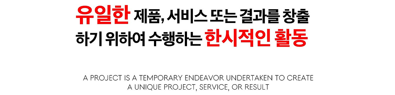 미국의 PMI의 PMBOK Guide에서는 프로젝트를 “유일한 제품, 서비스 또는 결과를 창출하기 위하여 수행하는 한시적인 활동”이라고 정의하고 있습니다.