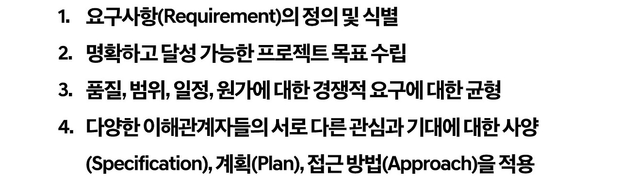 프로젝트의 중요 구성요소는 요구사항 정의, 프로젝트의 목표 수립, 품질, 범위, 일정, 원가에 대한 균형, 이해관계자들의 기대 이상의 사양을 적용하는 것입니다.