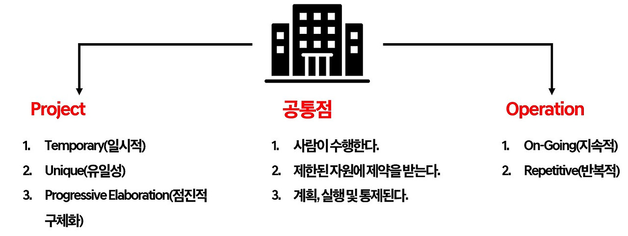 프로젝트는 일시성, 유일성, 점진적 구체화라는 특징이 있는 반면 오퍼레이션(운영 업무)은 지속적이고 반복적인 특징이 있습니다.