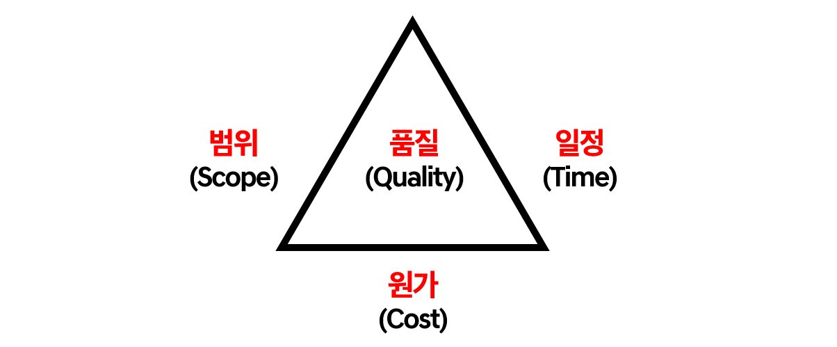 프로젝트관리의 제약조건은 범위와 일정, 원가와 품질로 얘기할 수 있으며 이중 범위, 일정, 원가는 서로 상충관계로, 어느 한 가지가 변경될 경우 다른 요소에 영향을 미칩니다.