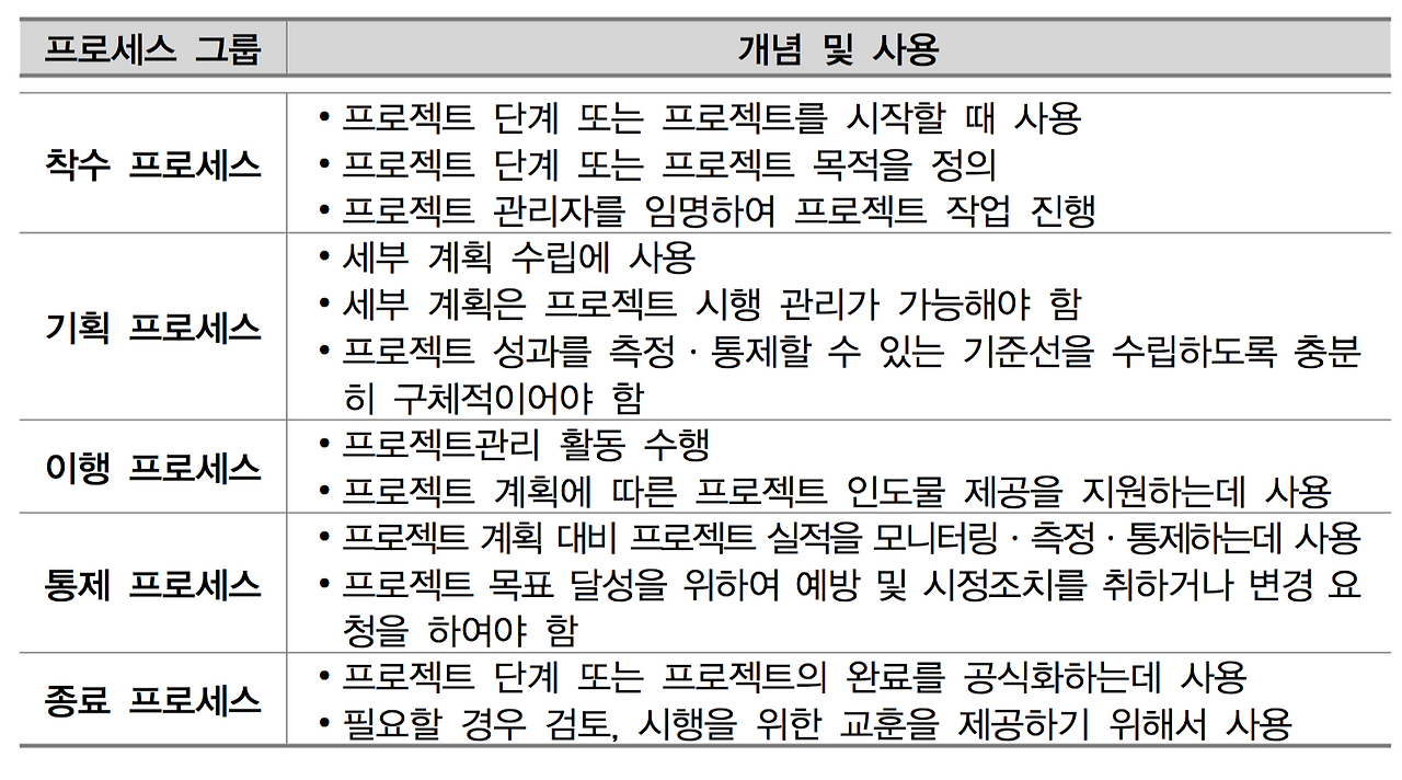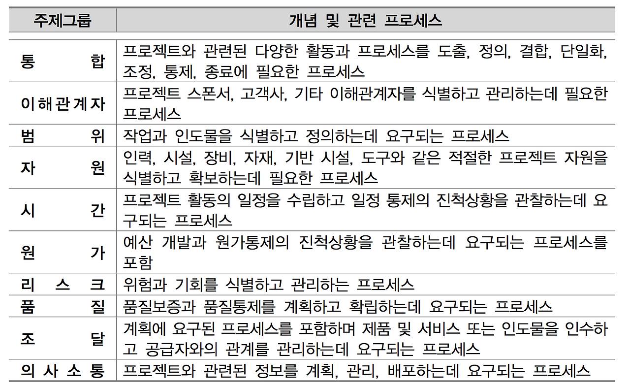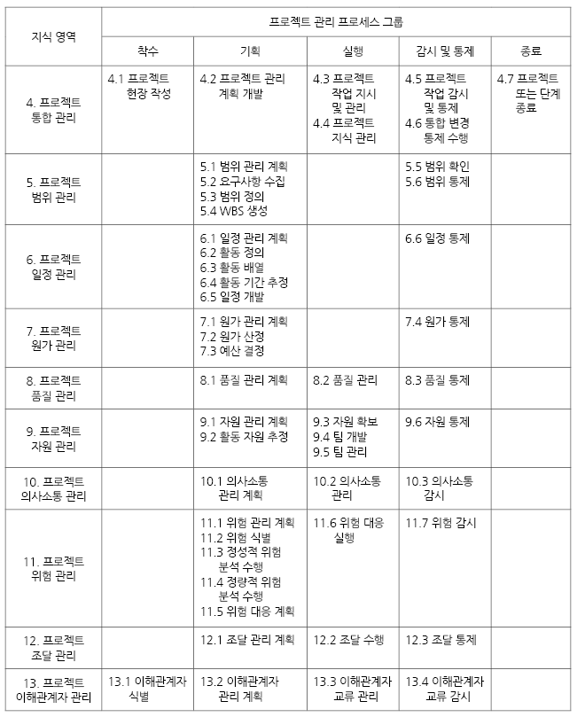 10개의 지식영역과 5개의 프로세스 그룹에 따라 49개의 논리적으로 연결된 프로세스로 구성되어 있습니다.