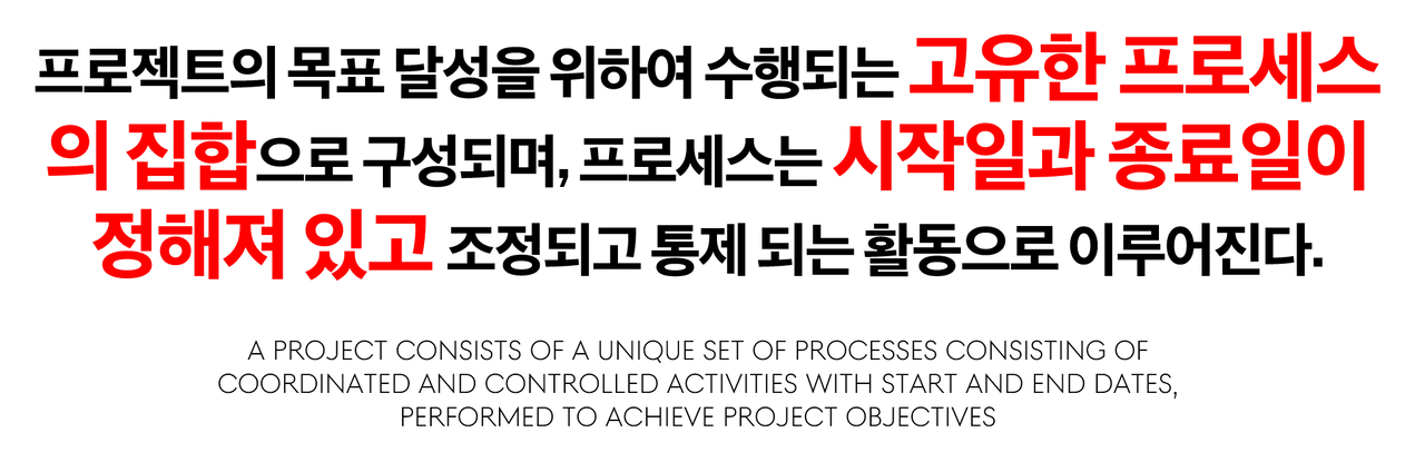 국제표준기구에서 만든 IOS 21500에서는 “프로젝트의 목표 달성을 위하여 수행되는 고유한 프로세스의 집합으로 구성되며, 프로세스는 시작일과 종료일이 정해져 있고 조정되고 통제되는 활동으로 이루어진다.”라고 정의하고 있습니다.