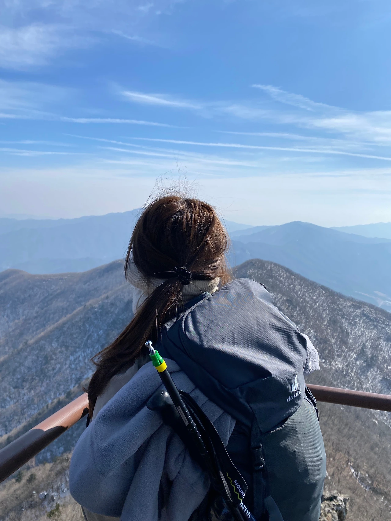 정상에서 사진을 찍은 뒤 돗자리를 펴고 컵라면과 김밥을 먹었다. 따스한 햇빛에 몸이 급 노곤해졌고 잠이 밀려왔다. 딱 한숨만 자면 좋겠다는 생각을 했으나 그랬다간 아마 입이 돌아간 채 영영 깨어나지 못할지도. 하산을 하다가 헬짱티쳐와 같이 산을 바라보며 '야호~!!!!' 하고 외쳤다. 살짝 부끄럽긴 했지만 그래도 혼자였다면 절대 못했을 텐데 이 또한 좋은 추억으로 남아있다.