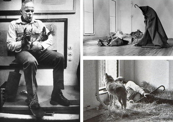 또한 <나는 미국을 좋아한다. 그리고 미국도 나를 좋아한다_1974> 라는 작업에서는 갤러리 바닥에 건초더미, 펠트 천 등을 깔아 놓고 그 곳에서 동물(코요테)과 대화하며 함께 3일 동안 생활하였다.
